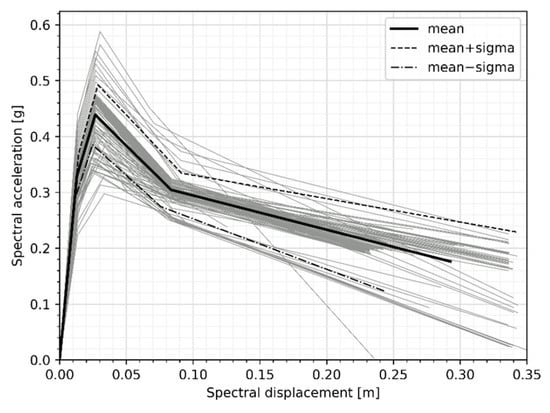The results of the 150 models considering complete randomness described in Section 2, which corresponds to the capacity curves of the typology, are presented in Figure 5. A structure with non-reinforced infill masonry increases the capacity and initial rigidity of the structure until the point where the masonry fails; because of said failure, the first significant lateral load capacity loss is observed. Additionally, the wide range of capacity curves developed can be seen, highlighting that the peaks of the capacity curves fluctuate from a minimum value of 187.8 kN to a maximum value of 358 kN, and the average value and deviation of the maximum capacity are 271.23 kN and 31.49 kN, respectively. The displacements vary in a range of 0.33 m to 0.45 m, with a mean of 0.42 m and a standard deviation of 0.038 m, mainly capturing the variability of the typology.