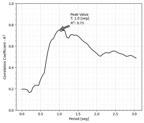 The best fit of the linear regression for the typology studied corresponds to the T = 1 s period, which is congruent with the building’s inelastic period because the structure loses stiffness. The period is amplified when the structure is subjected to high-intensity demands. With this premise, the fragility and vulnerability curves that must be used correspond to the period of 1 s.