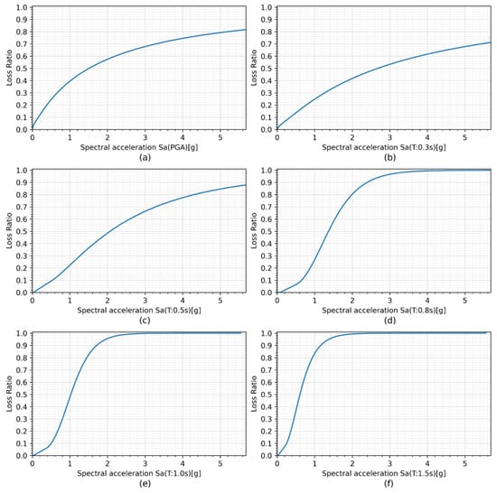 Vulnerability functions for the CR+CIP/LFLSINF+DNO typology for an intensity measure corresponding to a spectral acceleration for different periods: (a) PGA, (b) T = 0.3 s, (c) T = 0.5 s, (d) T = 0.8 s, (e) T = 1.0 s, (f) T = 1.5 s.