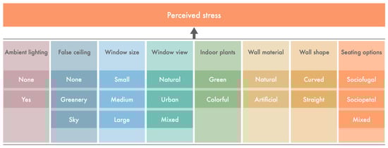 In summary, the literature discussed above emphasizes the influence of various interior design factors on people’s perception of healthcare environments, particularly in relation to perceived stress. The identified factors include ambient lighting, false ceilings, window size, window view, indoor plants, wall shape, wall materials, and seating options. Figure 1 summarizes the theoretical model that formed the basis for our study.