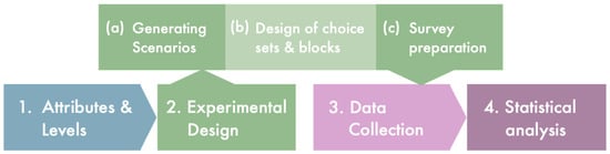 A diagram describing the main steps of the method, typical for the design of a discrete choice experiment.