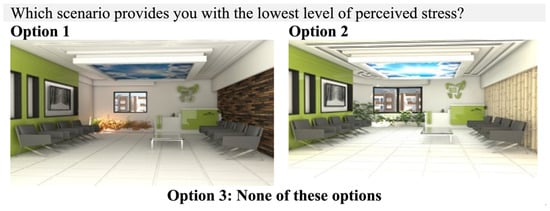 These 72 scenarios were divided into six blocks, each containing six choice sets comprising three alternatives (scenario 1, scenario 2, and none). These blocks were randomly assigned to participants. Participants were instructed to select the scenario that induced the least perceived stress for them or to indicate no preference for either option. Including the “none” option aimed to alleviate pressure on participants to make a choice and minimize the likelihood of exaggerated estimates of individual preferences. Visual representations of the options for each choice task were created using SketchUp(2019) and Photoshop software (2020). This visual approach is effective for diminishing external influences during the decision-making process in Discrete Choice Experiments (DCEs). The images were designed to provide viewers with a realistic perspective, allowing them to evaluate the simulation as if they were physically present. Figure 5 illustrates two images forming a choice set. The left image (Figure 5, Option 1) displays a setting without ambient lighting, a false ceiling with a virtual sky pattern, a small window with an urban view, colorful indoor plants, a straight-edged window wall, a feature wall with an artificial material (bricks), and a sociofugal seating pattern. In contrast, the right image (Figure 5, Option 2) presents a space with ambient lighting present, a similar virtual sky false ceiling, a large window with an urban view, green indoor plants, a curved window wall shape, a feature wall with natural material (bamboo), and a sociofugal seating layout.
