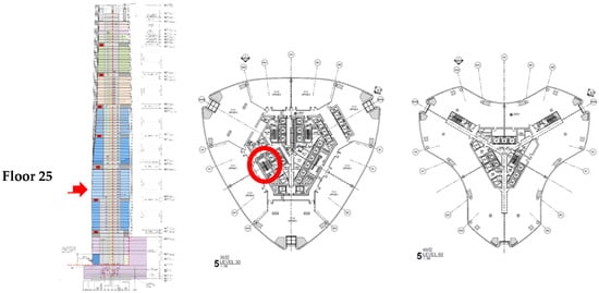 The building is an 87-story tower, 407 m in height, which consists of a commercial podium (floors 1–8), office floors (floors 11–20, 22–31, 33–41 and 43–51), service apartments (floors 53–62), a hotel (floors 64–76), and observation and club house levels (floors 77–78). Refuge floors are dispersed between these sections on floors 9–10, 21, 32, 42, 52, 63 and 74. The section and floor plans of the subject building are illustrated in Figure 1.