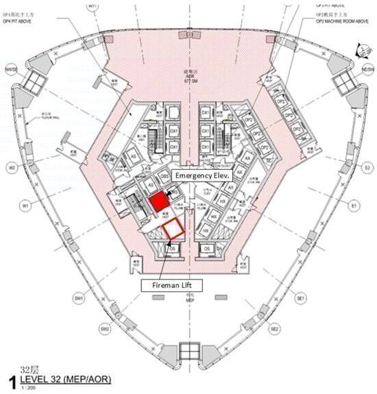 One of the two fire service elevators (lifts) is assumed to be used as the evacuation elevator, and it is highlighted in Figure 2.