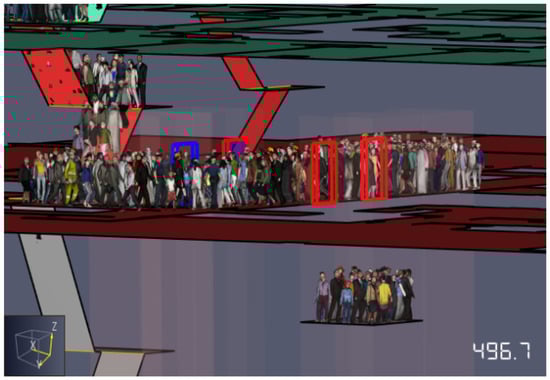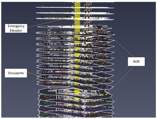 Figure 8 shows the operation of the evacuation elevator in the Pathfinder model. The evacuation elevator runs between the first floor to the refuge floors to pick up the evacuees, and the model assumes optimal evacuation decisions, in which the occupants estimate the time of waiting for the elevator versus the time of exiting through the exit stairs, and then selects the more optimal decision.