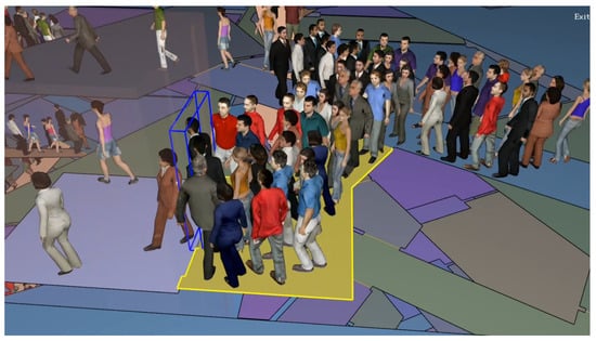 The Pathfinder model has been used in this analysis. It is an agent-based egress simulator that uses steering behaviors to model occupant motion. It consists of the three following modules: a graphical user interface, the simulator, and a 3D results viewer. Pathfinder uses a combination of steering mechanisms and collision handling to control how the occupant follows their seek curve. These mechanisms allow the occupant to deviate from the path while still heading in the correct direction toward their goal. The movement environment is a 3D triangulated mesh designed to match the real dimensions of the building being modeled. Additional technical information for Pathfinder can be found in the Pathfinder user’s guide and in the Pathfinder Technical Reference []. In the Pathfinder model, the simulated movement of the agents is calculated over a triangulated mesh on each floor. Floors are connected with exit stairs and elevators. The validation studies of the Pathfinder model have been performed to verify the fundamental speed–density and specific flow–density simulations with the SFPE correlations. The comparisons show that Pathfinder correctly simulates the speed–density curve in the SFPE Handbook [], and the capability of evacuation models to simulate evacuation using elevators was verified, which were reported in the Verification and Validation document of Thunderhead Engineering in 2015 []. The predictions of the Pathfinder model were reported as satisfactory.