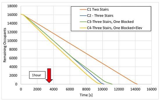 Figure 9 illustrates the evacuation time in the above four scenarios. The evacuation time of Scenario C1 is considered as a reference for the comparison of the evacuation time with other evacuation scenarios. In Scenario C3, due to the blocking of one exit stair in a section of the fire floor, the evacuation speed decreased, resulting in an increase of about 10% in the overall evacuation time from C3 to C2. In Scenario C4, even with the obstruction of a stair in the section where the fire occurs, the use of a high-speed elevator for evacuation shows that the entire evacuation process is essentially the same time required for the evacuation time with three stairs in the Scenario C2. It is found that the evacuation time is longer than 2.75 h in all the four scenarios.