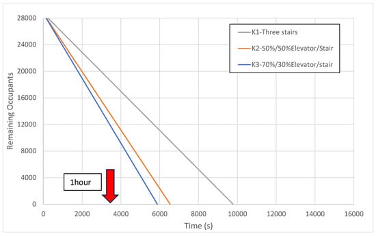 Three (3) evacuation scenarios were considered with an occupant load of approximately 28,000, which is estimated based on both International Building Code and Korean Building Code. Table 4 shows the summary of occupant loads using evacuation elevators from the refuge floors and the fastest evacuation time of 98 min is reached when approximately 60–70% of the total occupant loads use lifeboats/evacuation elevators. The occupants on the floors below Floor 7, where the first refuge floor and evacuation elevators are located, used exit stairs to evacuate. According to the occupant load factors in KBC and IBC, there are approximately 1500 to 2400 persons estimated on floors 1 to 6 in total. Each floor has 250 to 400 persons, and each of the three exit stairs quickly reaches at its full capacity.