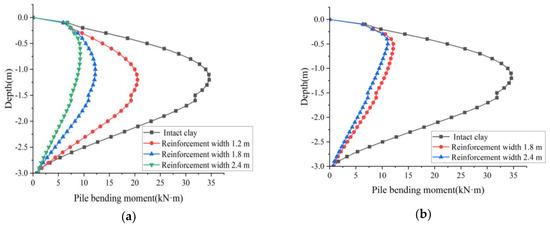 - Increasing the reinforcement width can significantly improve the bearing capacity of the pile foundation, and as the reinforcement width increases, the reinforcement effect will become better and better. Compared with the unreinforced case, the horizontal bearing capacity of the pile is increased by 83.0%, 104.3%, and 224.4%, respectively, corresponding to a reinforcement width of 2 times, 3 times, or 4 times the dimeter of the pile respectively. With the increase of the reinforcement width, the bending moment and deformation of the pile under the same horizontal load decrease significantly, while also having no significant effect on the location of the maximum bending moment of the pile.