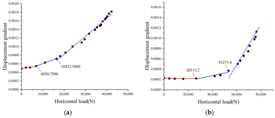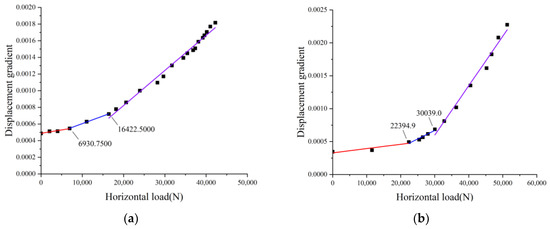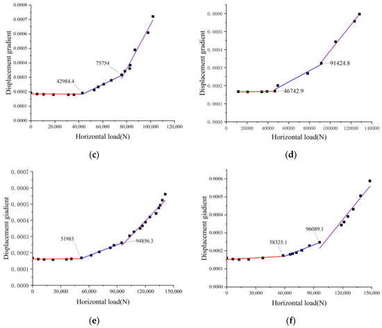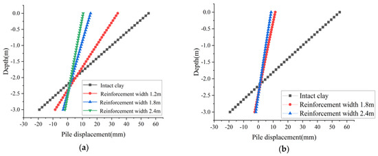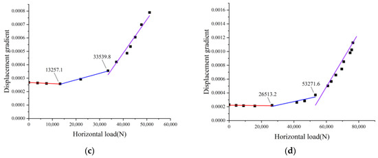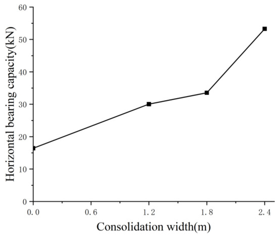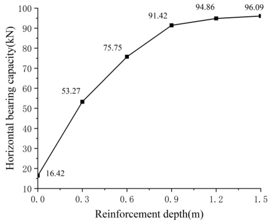 - The bearing capacity of the pile foundation gradually increases with the increase of the reinforcement depth. However, unlike the reinforcement width, the effect of increasing the reinforcement depth on improving the bearing capacity of the pile is gradually weakening, and it can be considered that there is an optimal reinforcement depth of 1.5D. Compared with the unreinforced situation, when the reinforcement depth is 0.5 times, 1.0 times, 1.5 times, 2.0 times, and 2.5 times the pile diameter, the horizontal bearing capacity of the pile body is increased by 224.4%, 361.3%, 456.8%, 477.71%, and 485.2%, respectively.