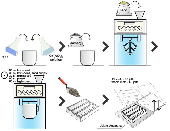 The prepared mix was placed in a three-section metal mold for making prism specimens, measuring 40x40x160 in two layers of mm. First, approximately 300 g of the mix was placed in each section. The placed mix was leveled for the first layer and compacted with 60 jolts (drops from a height of 15 mm) on a jolting apparatus. Then, the compartments were filled with the remaining mix, which was leveled for the second layer and compacted with a similar cycle of 60 jolts. An illustration of the production of specimens is shown in Figure 1.