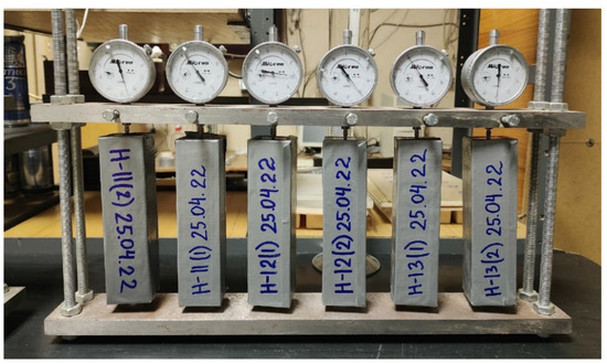 The linear deformation of the specimens was measured using the device shown in Figure 2, equipped with clock-type indicators with a division value of 1 µm. The specimens were installed in the measuring device immediately after stripping and waterproofing, i.e., 24 h after manufacture. During the test, the specimens were kept in the laboratory at a temperature of 20 ± 2 °C and a relative air humidity of 60 ± 5%. The expansion–shrinkage deformation was measured on two twin specimens simultaneously.