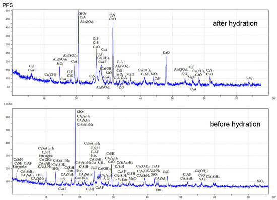 X-ray diffraction patterns of Nazarovo Power Station fly ash specimens before and after hydration.