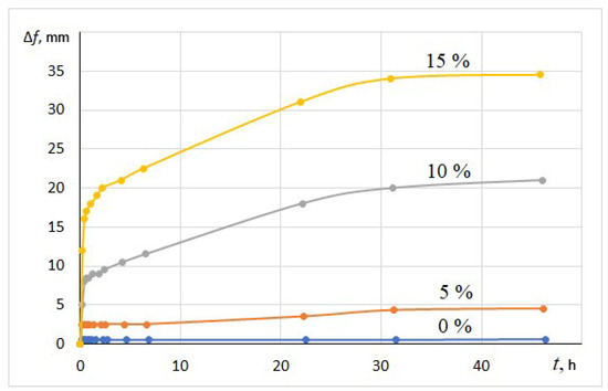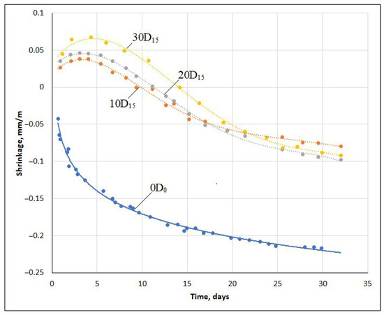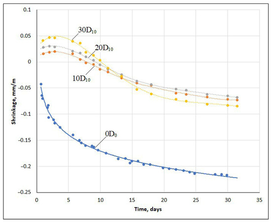 The results of testing specimens for shrinkage–expansion deformation during hardening are shown in Figure 7, Figure 8, Figure 9, Figure 10 and Figure 11.