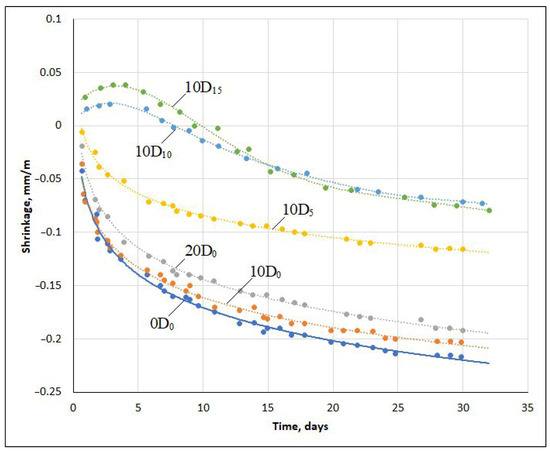 The presence of calcium nitrate in the fly ash reduces shrinkage to a greater extent (compositions 10D0, 10D5, 10D10 and 10D15) and even causes a slight expansion of the concrete, which turns into shrinkage after reaching maximum expansion at the age of about 3 days. The transition through 0 to the negative region of linear strain increment values occurs after 8–10 days. During this period, the concrete gains sufficient strength, and subsequent shrinkage is not dangerous in terms of crack formation. With the same amount of expansive agent, the shrinkage is smaller, the more Ca(NO3)2 in the additive. Noticeable expansion occurs starting with a 10% content of calcium nitrate.