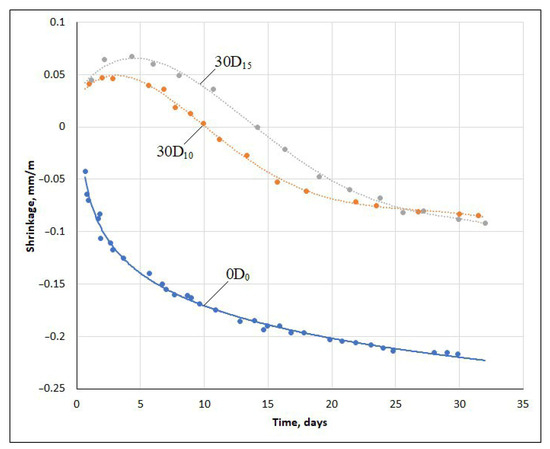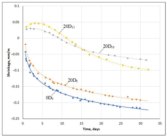 The effect of fly ash on the shrinkage of fine-grained concrete (compositions 0D0, 10D0 and 20D0) is positive (Figure 7). Shrinkage, although insignificantly, is reduced. This effect increases with an increase in the fly ash content in the binder. This result should probably be attributed to the expanding effect of fly ash from the Nazarovo Power Plant.