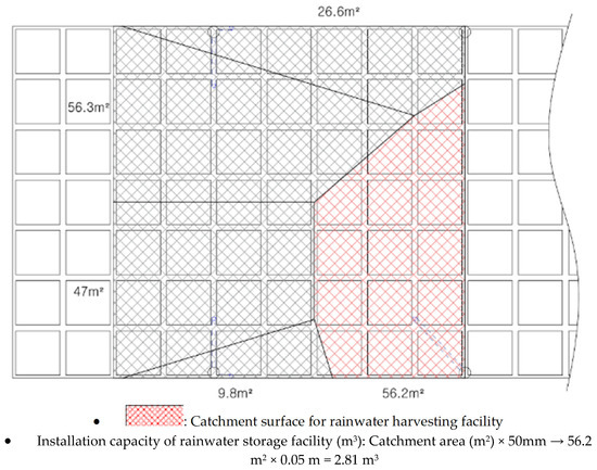 The catchment area of the canopy was calculated to be 56.2 m2. With a rainfall amount of 50 mm considered the catchment target, the storage tank capacity was estimated to be 3 m3 (Figure 2).