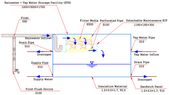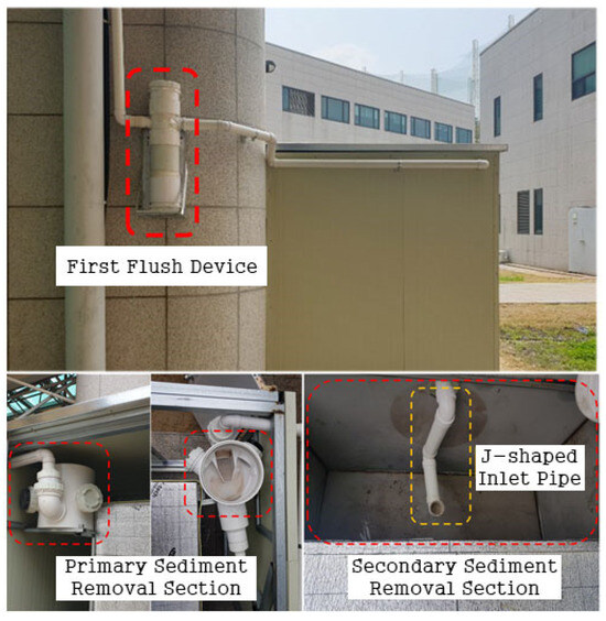 The design of the rainwater storage facility, installed at the Land and Housing Research Institute as part of a building test bed, is illustrated in (Figure 3). Collected pipes and associated equipment were implemented to capture rainwater runoff from the canopy catchment surface. To mitigate the risk of contaminants entering the storage tank during the initial rainfall, a float-based initial runoff treatment facility was installed. Additionally, a small sedimentation facility was positioned in front of the storage tank to further minimize contaminant ingress. The incoming rainwater is directed through a J-shaped inlet pipe to prevent the resuspension of settled sediments caused by the inflowing water, thus maintaining the overall water quality in the storage tank. An actual example of this installation is shown in (Figure 4).