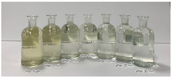 The quality of rainwater varies depending on various factors, such as the degree of contaminant accumulation on the catchment surface, the number of preceding dry days, and the intensity of rainfall. Comparing the water quality of rainwater with other studies is meaningless; the focus is on securing water quality suitable for the intended use by excluding the initial runoff and observing changes in water quality over time. The sampling times have been revised as follows: first flush, 1 min, 2 min, 5 min, 10 min, 20 min, and 30 min, based on the time when runoff started from the rooftops.