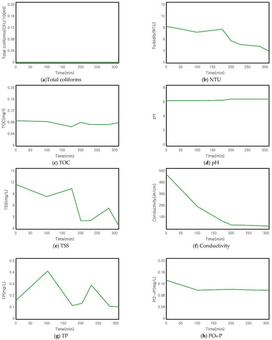 The water quality tests conducted in this study complied with the relevant laws and regulations of the Republic of Korea, where the tests were intended to be applied. According to South Korean law, Annex 1 of the Enforcement Rule of the Act on the Promotion and Support of Water Reuse provides the standards for rainwater reuse. The methods for water quality testing followed Article 6, paragraph 1, subparagraph 5 of the Act on Testing and Inspection of Environmental Fields (Environmental Pollution Process Test Standards—Water Pollution) [12] and the National Institute of Environmental Research Notification No. 2022-12 [13]. Additionally, as the precision and accuracy requirements are specified in the relevant regulations, the water quality tests were conducted based on these legal standards, ensuring the reliability of the measured results.