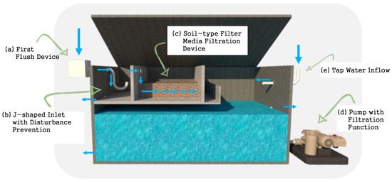 As described in (Figure 3), the water quality treatment process for the rainwater storage facility installed at the test bed was conducted as follows(Figure 8): To ensure high-quality rainwater storage and supply, an initial runoff treatment facility (a) was installed to manage the first flush, and a J-shaped inlet (b) was implemented to prevent the resuspension of sediments due to the inflow of water. The collected rainwater was then directed through a filtration facility (c) filled with soil-based filter media before entering the storage tank. To guarantee sufficient water quality for usage, a pump with filtration capabilities (d) was installed. Additionally, to maintain the stability of the water resource, the system was connected to a supplementary water source, allowing the continuous operation of the rainwater harvesting facility. This process was followed for the water quality treatment in this study.