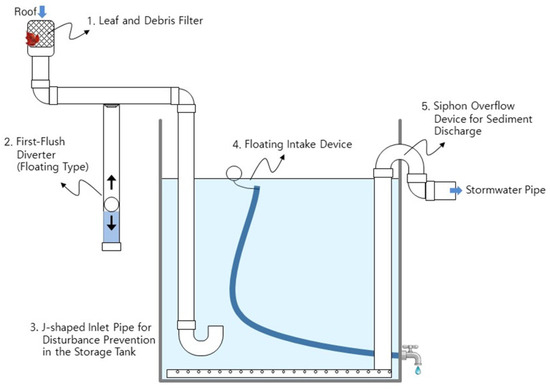 When the collected rainwater enters the storage tank, the water body can be disturbed by the flow velocity and drop. In such cases, contaminants that have settled on the bottom may resuspend, deteriorating the overall water quality in the storage tank. To prevent this, a J-shaped inlet pipe should be installed to allow the rainwater to enter the storage tank in an upward flow direction (Figure 9).