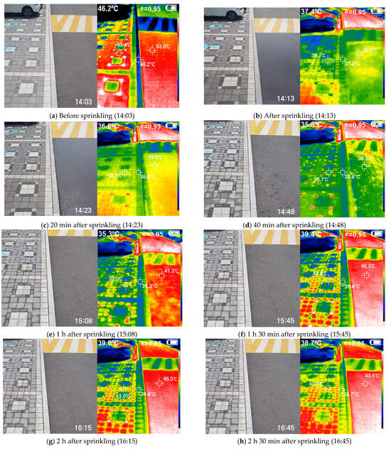 This study analyzed the effect of temperature reduction through road sprinkling and mist spraying using rainwater. The experimental results showed that asphalt and permeable pavements reduced temperature to close to 15 °C. In particular, permeable pavement exhibited a more sustained cooling effect than asphalt pavement, interpreted as being due to the porous pavement’s ability to absorb water and reduce surface temperature over a more extended period through evaporation.