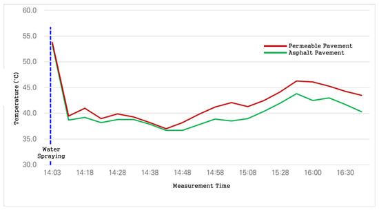 The temperature of the parking lot surface was 53.8 °C for asphalt pavement and 53.4 °C for permeable pavement, and it dropped sharply to approximately 39.5 °C and 38.7 °C, respectively, immediately after sprinkling (Figure 10). The surface temperature, which dropped below 40 °C, remained for more than 2 h, slightly exceeding 40 °C until the experiment ended at 4:45 PM. Until the experiment’s end, the permeable pavement’s surface temperature was about 3 °C lower than the asphalt pavement (Figure 11). This is considered to be due to the moisture retention effect of the permeable pavement, which maintained the temperature reduction for a more extended period.