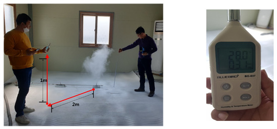We conducted indoor experiments using a temperature and humidity meter to measure the changes in temperature and humidity due to mist spraying and to determine the optimal time interval and nozzle spacing for mist spraying. To analyze the impact of ambient temperature, we measured temperature and humidity at a height of 1 m and a horizontal distance of 2 m from the spray device (nozzle) every minute (Figure 13).