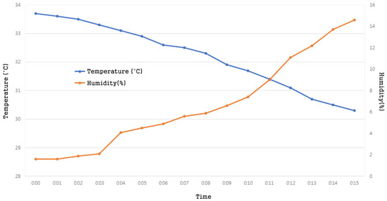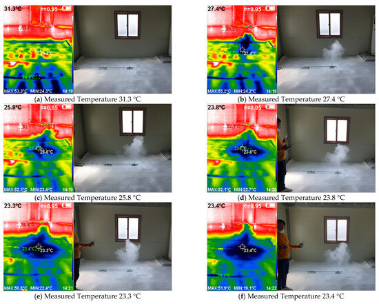 The mist was sprayed to determine the optimal distance for the mist nozzles, and images were captured using thermal and regular cameras at 1 min intervals. The images were then analyzed to determine the influence range of the mist nozzles. Before mist spraying, the temperature was 33.7 °C. After 6 min of mist spraying, the temperature decreased by 1 °C. After 10 min, it further decreased by 2 °C, showing a cooling effect. Over a span of 15 min, the temperature consistently decreased, reaching a reduction of 3.4 °C (Figure 15).