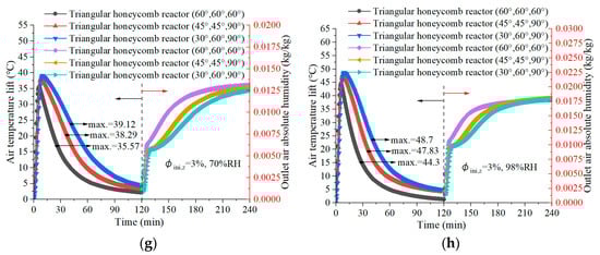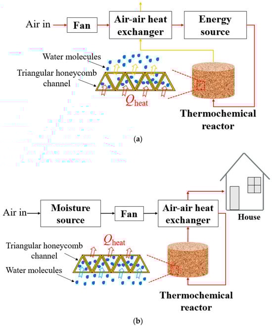 - Heat conduction and mass diffusion are considered within the triangular honeycomb channels, with the thermal conductivity, specific heat, and density of both air and zeolite 13X taken as functions of water vapor content. This enables the model to account for heat and mass transport processes during adsorption and desorption [24].