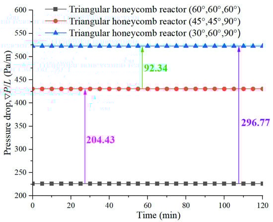- Pressure loss is a critical parameter in evaluating the thermal performance of a reactor. Pressure drop analysis showed that the reactor with angles of 60°, 60°, and 60° achieves the lowest pressure drop of 226.12 Pa/m, while the reactors with angles of 45°, 45°, and 90° and 30°, 60°, and 90° experience higher pressure drops of 430.55 Pa/m and 522.89 Pa/m, respectively.