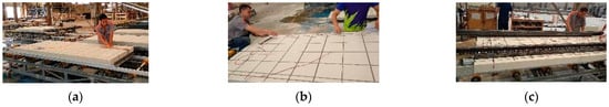 Manufacturing process of specimen: (a) Grooving of the TMF plate; (b) Placement of longitudinal steel bars; (c) Placement of the keel and transverse steel bars.