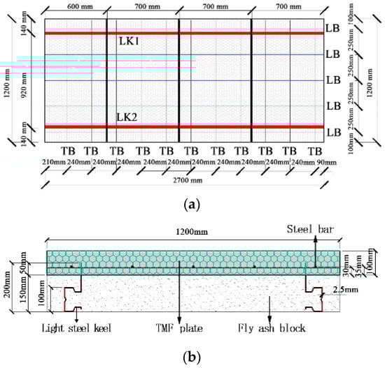 The detailed dimensions of the specimen are presented in Figure 4. In Figure 4a, LK denotes the light steel keel, TB represents the transverse steel bar, and LB indicates the longitudinal steel bar. Figure 4a illustrates the specific dimensions of the composite plate specimen. The overall size of the other specimens matches that of the composite plate specimen, which consists of a 2700 mm monolithic TMF plate. Figure 4b provides a sectional view of the composite wall. The TMF plate has a thickness of 100 mm, and the keel has a section height of 200 mm, with 50 mm embedded in the TMF plate, leaving 150 mm of exposed section height.