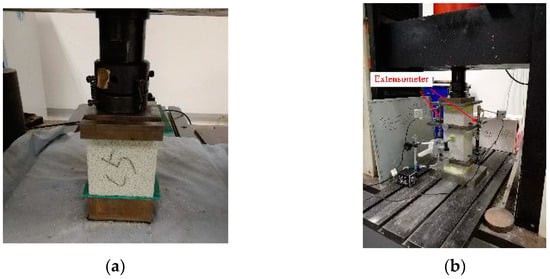 Basic mechanical tests were conducted on TMF plate materials, focusing on cube compressive strength, prism compressive strength, and elastic modulus. Two different design strengths were evaluated: 5 MPa (designated as A5) and 10 MPa (designated as A10). According to the “Test methods for inorganic hard thermal insulation products” (GB/T5486-2008) [], the cube specimens were sized at 100 mm × 100 mm × 100 mm, while the prismatic specimens measured 100 mm × 100 mm × 300 mm. To address surface bubbles on the TMF plate specimens, gypsum was applied for treatment []. An extensometer was positioned within a 150 mm range in the center of the prismatic specimens to measure longitudinal deformation. The elastic modulus was determined by analyzing the initial stress-strain relationship of the material. Three specimens from each strength category (A5 and A10) were tested, and the average results were calculated. The compression testing setup for the TMF plate material is illustrated in Figure 5, with the results summarized in Table 2. In Table 2, fcu represents the cube compressive strength, SDc denotes the standard deviation of the cube compressive strength, fc indicates the prism compressive strength, SDp is the standard deviation of the prism compressive strength, and E refers to the elastic modulus of the TMF plate material.