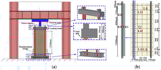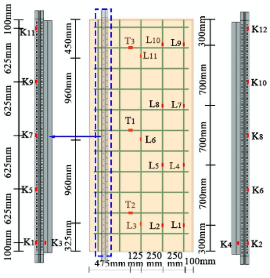 Two light steel keels were equipped with longitudinal displacement meters to record the vertical displacement within the 2250 mm standard distance of the composite wall keel. The displacement meter arrangement is shown in Figure 6a. Strain gauges were primarily arranged on the keel and longitudinal steel bars. Four vertical strain gauges were placed on the keel, labeled K1, K2, K3, and K4. Five strain gauges were installed on the longitudinal steel bar, labeled L1, L2, L3, L4, and L5. Additionally, one strain gauge, T1, was positioned on the transverse steel bar in the middle of the composite wall. The strain arrangement is depicted in Figure 6b.