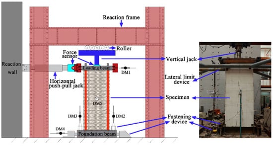 Seismic performance test: Building on the compression test device, a horizontal push-pull jack was added to apply a horizontal reciprocating load. A fastening device was set on both sides of the foundation beam to prevent horizontal sliding and overturning of the specimen. According to the compression test of the composite wall, a 120 kN vertical load was applied to the LS-TMF composite wall using a vertical jack, and this load was kept constant. Repeated horizontal loads were then applied to the loaded beam through the horizontal pulling and pressing jacks. The height of the loading point from the foundation is 2810 mm. A horizontal lateral limit device was set up to prevent out-of-plane instability of the specimen. The loading device and test site are shown in Figure 7.