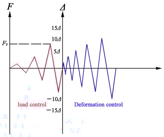 The load-deformation loading system was adopted, as shown in Figure 8. Before loading and yielding, the specimens were loaded using load control and graded loading. After the specimen yielded, deformation control was adopted, where the deformation value corresponded to the maximum yield displacement value of the specimen. The step difference for control loading was determined by multiplying the yield displacement value. Given the low strength of the TMF plate material, each stage of load was applied once to observe the damage form of the composite wall during large deformation and to prevent premature fatigue failure of the composite wall.