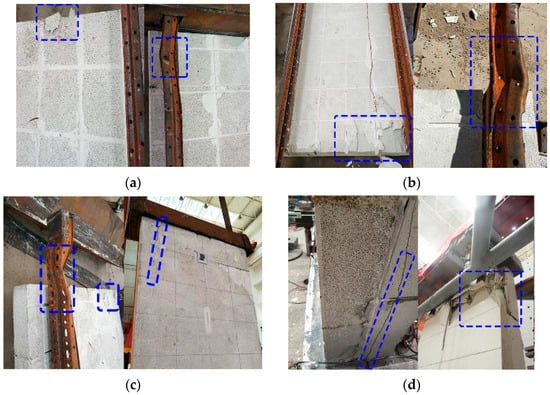 The ECW10 specimen displayed no evident signs of damage during the initial loading phase. When subjected to a horizontal load of 30 kN, a faint sound was emitted by the TMF plate, which grew louder upon the application of a 40 kN horizontal load, resulting in cracking at its base where it was embedded in the keel. As the horizontal load increased, the destructive sound of the TMF plate intensified, and cracks gradually developed at the keel embedding location. When the horizontal load reached its peak, cracks appeared on both sides of the TMF plate at the keel embedding location, resulting in through cracks. This caused the light steel keel and TMF plate to peel off, reducing the specimen’s bearing capacity, as shown in Figure 11b. The failure process was similar to that observed for ECW5 but occurred at higher loads due to the enhanced strength of the ECW10 specimen.