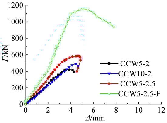 Table 4 presents the key characteristic values observed during the tests. The peak load (Np) of each specimen is compared based on the bearing capacity of the CCW5-2 specimen. In the table, Np represents the peak load, Δp denotes the displacement corresponding to the peak load, and Δu indicates the displacement at the point of specimen failure.