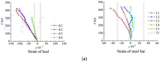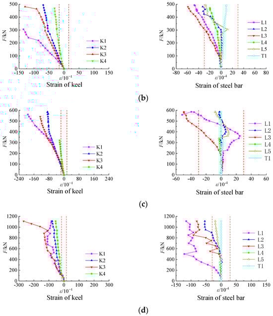 The stress state of the steel bars and light steel keels in the composite wall was analyzed by examining the strain points K1–K4 for the keel, L1–L5 for the longitudinal steel bars, and T1 for the transverse steel bars. The load-strain curve of the specimen is shown in Figure 13a–d. The red dotted lines in the figures indicate the yield strain values for the steel bars and the light steel keel, respectively.