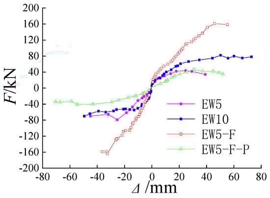 The hysteretic curves “load (F)-horizontal displacement (Δ)” for the 4 LS-TMF composite wall specimens are shown in Figure 14. The skeleton curve of specimens is shown in Figure 15. In the figure, F represents the horizontal load, and Δ denotes the horizontal displacement.