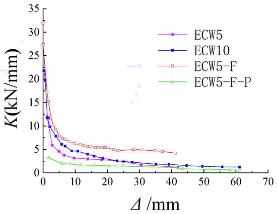 The average secant stiffness was used to analyze the stiffness degradation of the specimen, as illustrated in Figure 16. The calculation formula for average secant stiffness is provided in Equation (4).