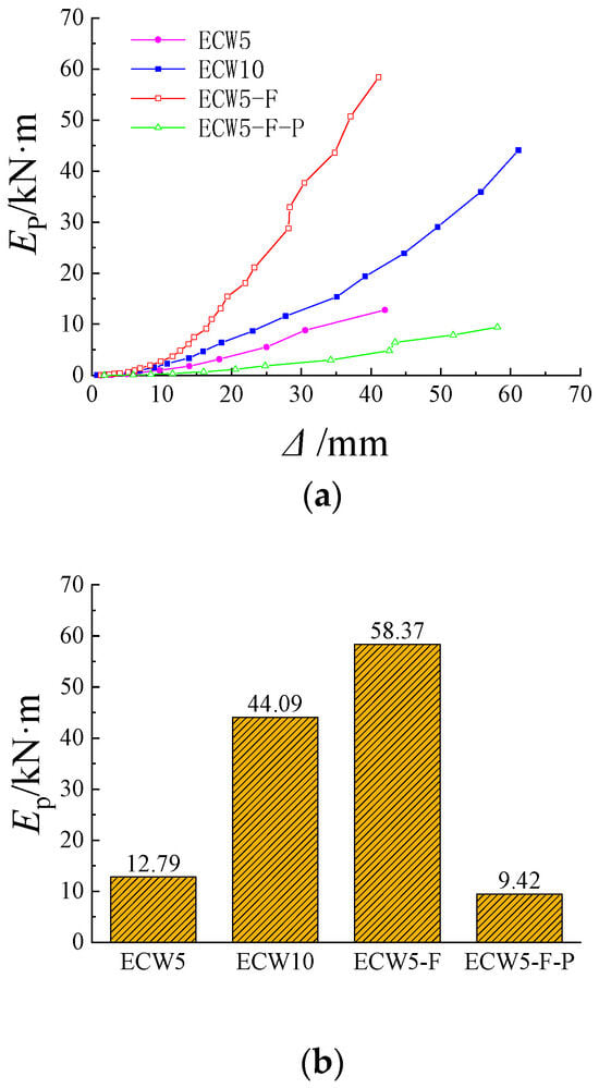 The cumulative energy dissipation (Ep) of the specimen was analyzed by superimposing the envelope area of each cyclic hysteresis loop, which reflects the energy dissipation capacity of the specimen, as shown in Figure 17.