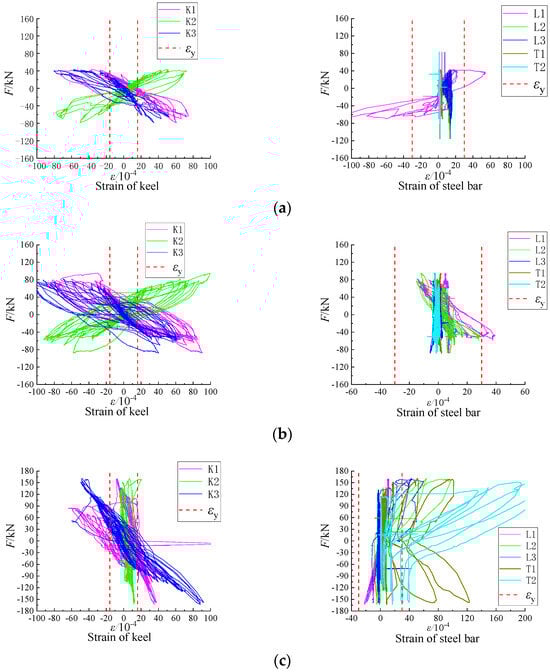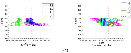 The load-strain curve was used to analyze the stress state of the light steel keel and steel bars in the composite wall. The analysis focused on the strain values K1, K2, and K3 at the column foot of the light steel keel. For longitudinal reinforcement, the strains L1, L2, and L3 were analyzed, while for transverse reinforcement, T1 and T2 were considered. The strain analysis of the light steel keel and steel bar of the specimen is illustrated in Figure 18. In these figures, the vertical axis represents the horizontal load, the horizontal axis indicates the strain value of the specimen, and the red dotted line marks the yield strain value for both the steel bar and the light steel keel, respectively.