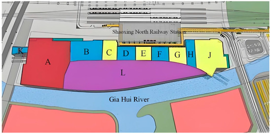 The Shaoxing High-speed Railway North Station TOD complex deep foundation pit is located in the station area of the high-speed railway Shaoxing North Station. The excavation depth is about 16 m, and the support structure adopts an underground diaphragm wall with internal support, using the open excavation method. The pit plan is shown in Figure 1. The pit is divided into eleven sub-pits according to the actual conditions of the site. Three reinforced concrete internal supports are set up, and the excavation depth of the pit in the pit part (the subway station area) is about 20.7 m. Four internal supports are set up (the deepening position of the local subway line 1 end wells is added with one support). Near the side of the North Station and the station end well, a 1.2 m-thick diaphragm wall is used, and the rest of the diaphragm wall is a 1 m and 0.8 m-thick diaphragm wall. All four internal supports are made of reinforced concrete, and the typical section of support arrangement is shown in Figure 2. The total length of the pit is 675.1 m, the width of the standard section is 44.9 m, and the total construction area is about 45,859 square meters. The pit is divided into three phases with 11 sub-pits. Phase 1 (Area A, Area C, Area E, Area G, and Area J) → Phase 2 (Area B, Area D, Area F, Area H, and Area K) → Phase 3 (Area L). There are four excavation phases for the one-phase pit and the two-phase pit, and three excavation phases for the three-phase pit. After each phase of excavation, the main structure of the building is built back to the ground elevation and then the next phase of excavation is carried out. K pit is a subway pit, adopting a 1.2 m thick C35 underground diaphragm wall. The first course is concrete support using 900 × 900 C45 reinforced concrete supports. The second and third courses are steel support using φ609 × 16 steel pipe supports. The fourth course is concrete support using 1200 × 900 C45 reinforced concrete supports, and the fifth and sixth courses are steel support using φ800 × 16 steel pipe supports. A typical cross-section of the support arrangement profile of K pit is shown in Figure 3. The Hangzhou–Shaoxing elevated bridge is located at the end well of the pit, and the nearest distance of the pit sideline from the bridge pier is only 3.8 m, which is located in the main influence area of the pit excavation (the main influence area is about 0~1 times of the depth of the excavation, the secondary influence area is about 1~3 times of the depth of the excavation, and the non-influence area is about 3 times of the depth of the excavation from the pit). The plane of the pit in the area of K and the layout of the monitoring points are shown in Figure 4.