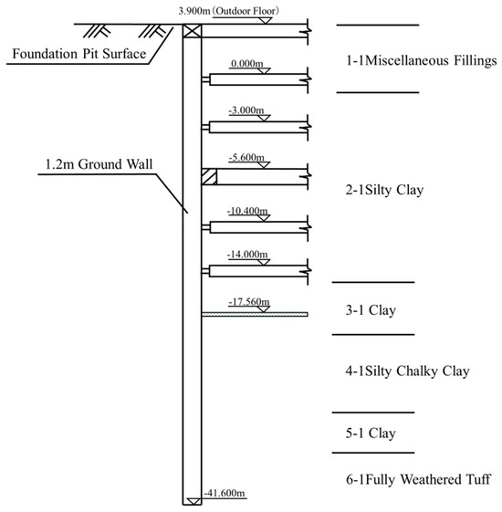 - Jiang, Z.; Zhu, S.; Que, X.; Ge, X. Deformation Effects of Deep Foundation Pit Excavation on Retaining Structures and Adjacent Subway Stations. Buildings 2024, 14, 2521. [Google Scholar] [CrossRef]