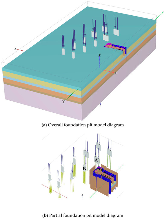 Finite element model of the foundation pit. (a) Overall foundation pit model diagram. (b) Partial foundation pit model diagram.