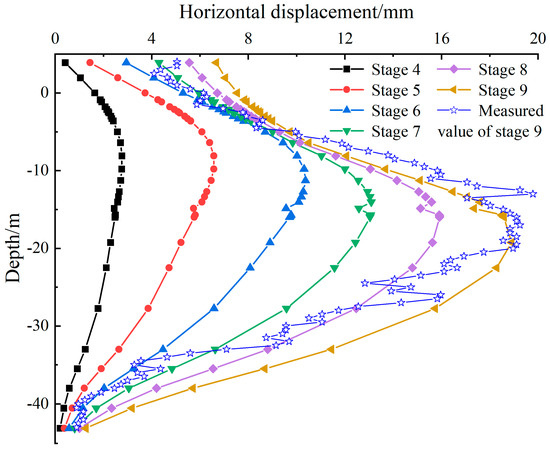 A three-dimensional finite element model was developed based on Area K of the Shaoxing North Station’s metro excavation site to analyze the impact of the excavation on adjacent elevated bridge piers. The model that reflects the actual project was divided into nine construction phases. The actual excavation scenarios were simulated by activating and deactivating elements in the finite element model, with detailed excavation scenarios outlined in Table 3. A comparative analysis was conducted between the measured and simulated horizontal displacements of the diaphragm wall at monitoring point ZQT82 in Area K, as depicted in Figure 6. It demonstrated that simulated and measured horizontal displacements of the diaphragm wall matched well, demonstrating a similar trend and confirming the accuracy of the computational model.