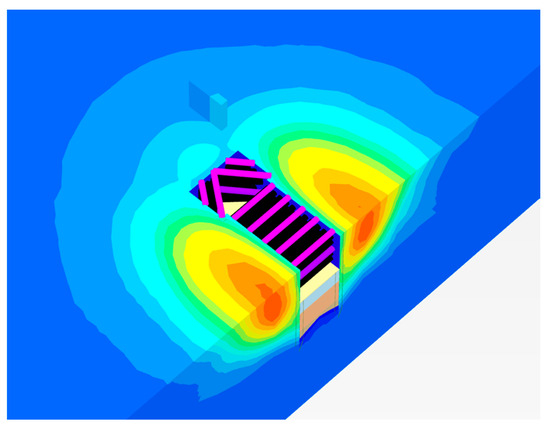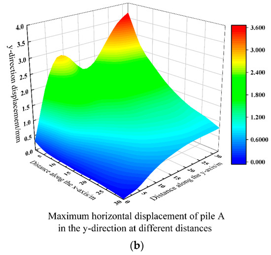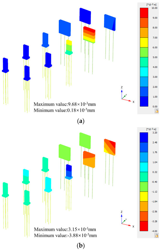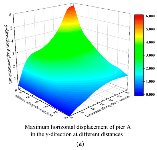 Figure 19 depicts the nephogram of horizontal displacement of the elevated bridge in the x-axis direction. It was revealed that the maximum horizontal displacements of piers and pile foundations gradually decreased as the distance between the elevated bridge and the foundation pit increased, but their trends were somewhat different. The horizontal displacement of the pier in the x- and y-axis directions exhibited a gradual change as it moved closer to the foundation pit. Then, as the distance increased, the horizontal displacement decreased sharply, with a more pronounced reduction observed in the x-axis direction compared to the y-axis direction. This disparity was primarily attributed to the greater impact of corner effects from the foundation pit on the y-axis direction than on the x-axis direction.